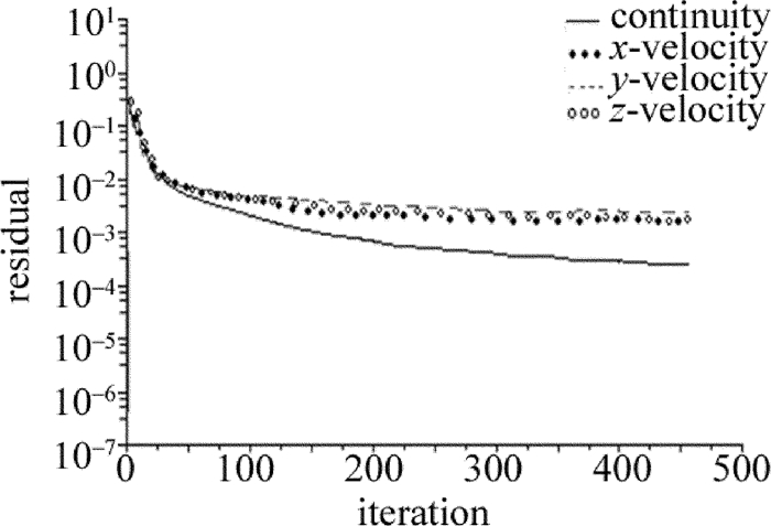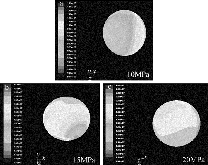 首先是殘差圖的收斂計(jì)算,設(shè)計(jì)的收斂參量為1×10-3。圖 4為殘差圖的收斂計(jì)算結(jié)果,橫坐標(biāo)為迭代次數(shù),縱坐標(biāo)為殘差值的大小。圖 5為單注水口耦合腔頂部水流入口壓力分布圖,縱坐標(biāo)為水束壓力大小(MPa)。由圖 5可以看出:當(dāng)水束壓力為10MPa時(shí),水流入口處壓力分布非常不均勻,具有明顯的各向異性,且注水口一側(cè)的壓力明顯較大;隨著水束壓力的不斷增大,水束壓力的各向異性逐漸減弱,在水束壓力達(dá)到20MPa時(shí),入口的水壓趨近均勻。