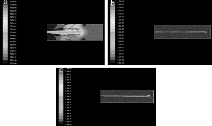 經(jīng)光液耦合后的水束噴射到空氣中的情況是比較復(fù)雜的。水束會(huì)在噴口處發(fā)生縮流,水束會(huì)突然縮小為原來(lái)的80%,然后水束在空氣壓力的作用下,其直徑又慢慢變大,最終導(dǎo)致激光束從水束中逃逸。噴嘴口的大小和水束的流速均會(huì)影響噴射流長(zhǎng)度,本次仿真選取水束壓力為20MPa,依次對(duì)0.3mm, 0.4mm及0.5mm 3種口徑噴嘴射出的水束穩(wěn)定性進(jìn)行仿真,如圖 7所示。本次仿真設(shè)置的邊界為100mm。