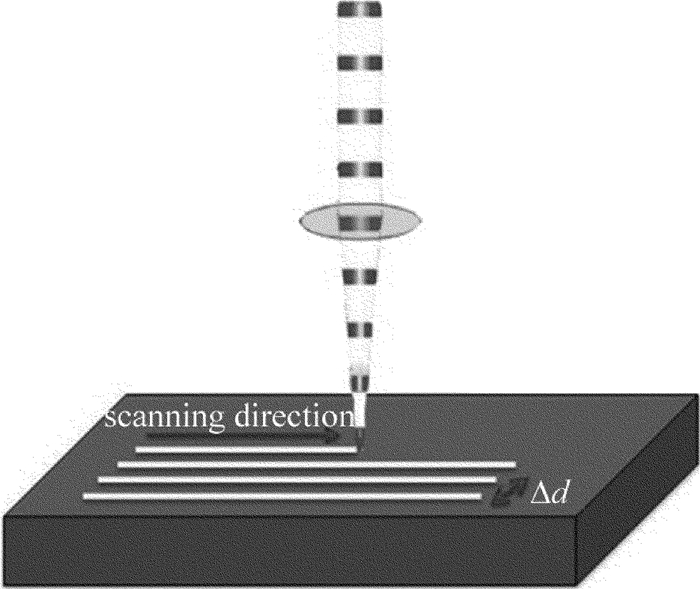 實驗方法如圖 2所示。將1.5mmCFRP板置于激光焦平面上,分別研究平均功率、掃描速率、重復頻率、掃描次數對熱影響區及掃描深度的影響。為了更加均勻地去除整個碳纖維復合材料和提高去除效率,對軌跡進行多次循環掃描,并通過動態聚焦系統實現焦點補償。在切割中為了避免切縫過窄造成的遮蔽效應,掃描若干條間距為Δd的平行軌跡來增加切縫寬度,最終實現1.5mmCFRP切割。