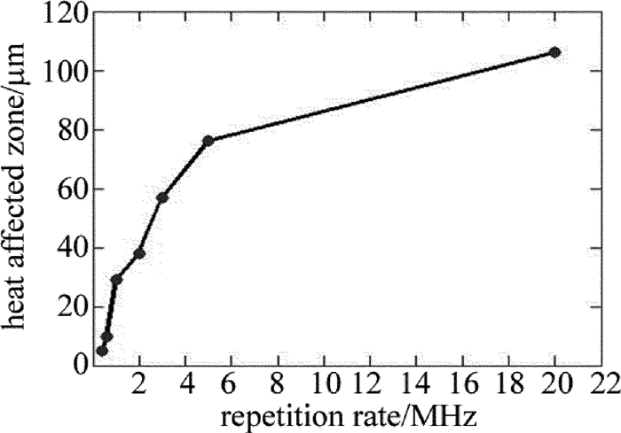 6是平均功率為60W、掃描速率為10m/s時,重復頻率與熱影響區的關系。在圖 6中,重復頻率為0.4MHz~5MHz時熱影響區與重復頻率幾乎成正比關系,隨著重復頻率的繼續增加,熱影響區增大并趨于平穩。主要是因為在平均功率、掃描速率不變時,隨著頻率增加,單脈沖能量減少,達到燒蝕閾值的能量也減少,所以脈沖能量用于CFRP的去除效率更低,使得熱損傷增大;另外,隨著頻率的增加,相鄰脈沖的時間越短,積累的熱量也越多,使得熱損傷相應的增加,從而熱影響區增大。